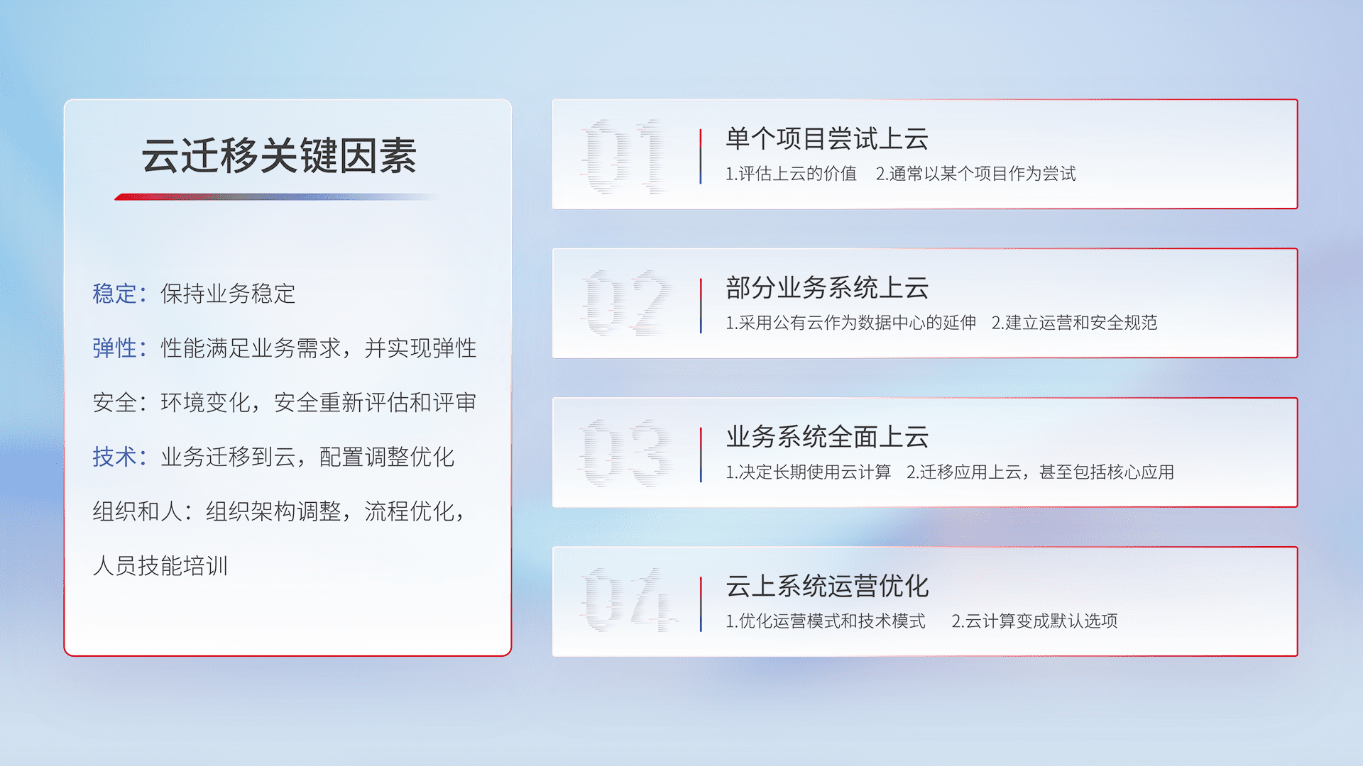 结合实际业务,,,,从规划设计、、、云平台选型、、云原生改造、、、数据迁移、、集成交付,,迁移全过程为客户识别最佳上云路径,,,,做好风险识别管理,,,设计网络架构、、、身份权限、、安全审计合规、、、、操作审计、、、日志审计、、、、监控告警策略、、、、多站点容灾设计等,,,对云上基础设施进行整体规划,,,,提升IT治理水平,,,,以满足弹性、、高可用、、、、高性能的需求。。。
