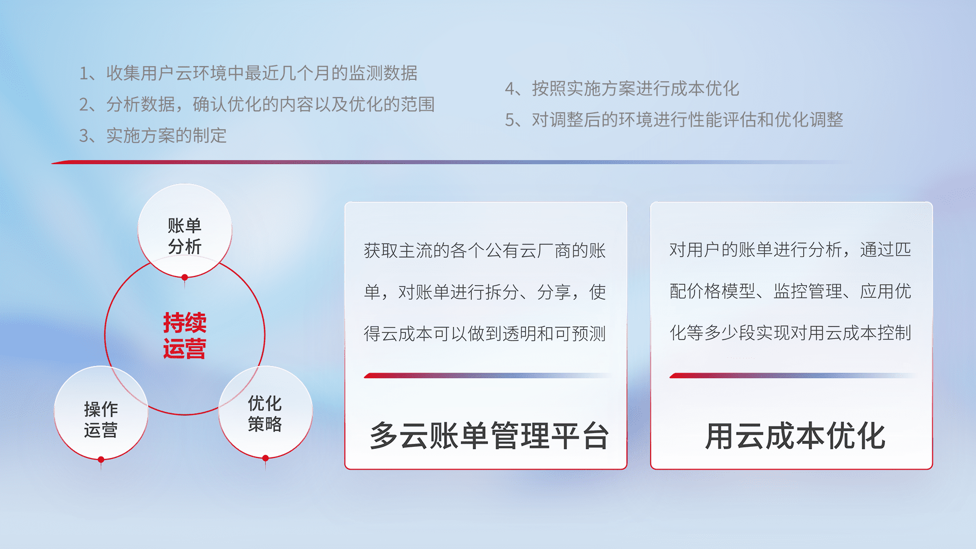 通过灵活运用多种自动化迁移工具,,,帮助企业用户实现业务和数据高效 、、、稳定的上云迁移和云上迁移,,,采用自研多云纳管平台,,,,以中立管理模式,,,解决多组织、、多云、、、、多运维厂商的复杂关系的管理,,,保证多云平台资源配置的一致性,,实时掌控云资源运行数据,,运用智能化工具分析云资源多云平台的管理服务,,,透明化管理成本支出,,,,用云成本可预测、、用云费用可优化、、、、云资源配额有据可依。。。。